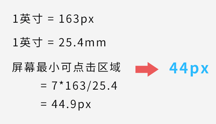 另外再提一点,大家都知道iOS推荐的最小可点击元素的尺寸是44*44 px。为什么是这个尺寸呢?我们来计算一下,以iPhone 4为例,它的屏幕ppi是163px(一英寸长度里有163像素),1英寸=25.4mm,1英寸=163px,用户在屏幕中可点击的物理尺寸是7mm-9mm,所以屏幕最小可点击区域=7*163/25.4=44.9px,也就是我们常说的44px。