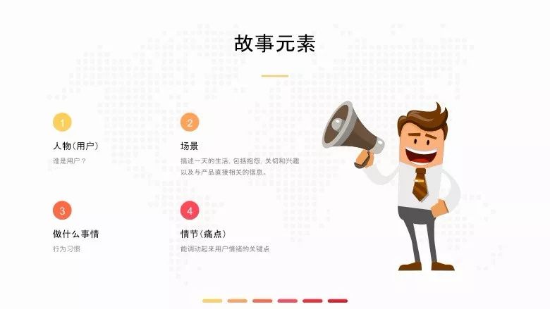 一个好的故事包含4个要素,第一,人物即围绕哪些用户展开的故事;第二,场景;第三,做什么事即用户的行为习惯,日常行为描述;第四,画龙点睛之笔情节,是否结合了用户使用时痛点引起共鸣?