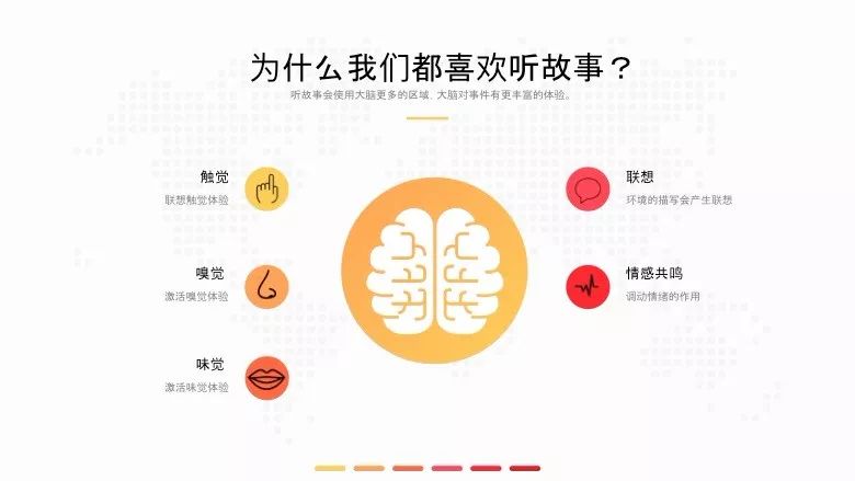 为什么大家都爱听故事呢?这跟我们的大脑息息相关,听故事会使用大脑更多的区域,大脑对时间有更丰富的体验。例如:写到嗅觉的部分会激活嗅觉体验,写到关于环境的描写会激发人产生联想。你会享受这种经历,更深入理解故事中的信息,记忆的时间也会更长久。这就是为什么畅销书籍改编成影视作品会非常考验导演的能力,读者从书籍中联想到的远远比导演呈现的更多,并且乐于享受这种过程。