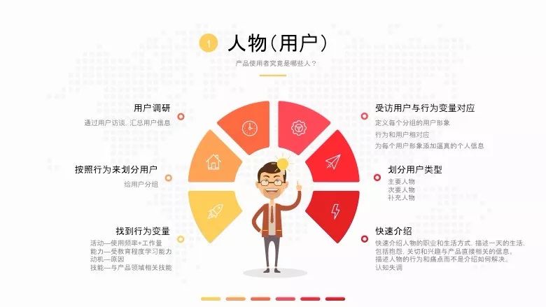 用户变成的单独的形象呈现在你面前,接下来要由用户体验人员来划分用户类型,分主次划重点。主要人物,次要人物和补充人物的划分也决定了产品定位和方向。