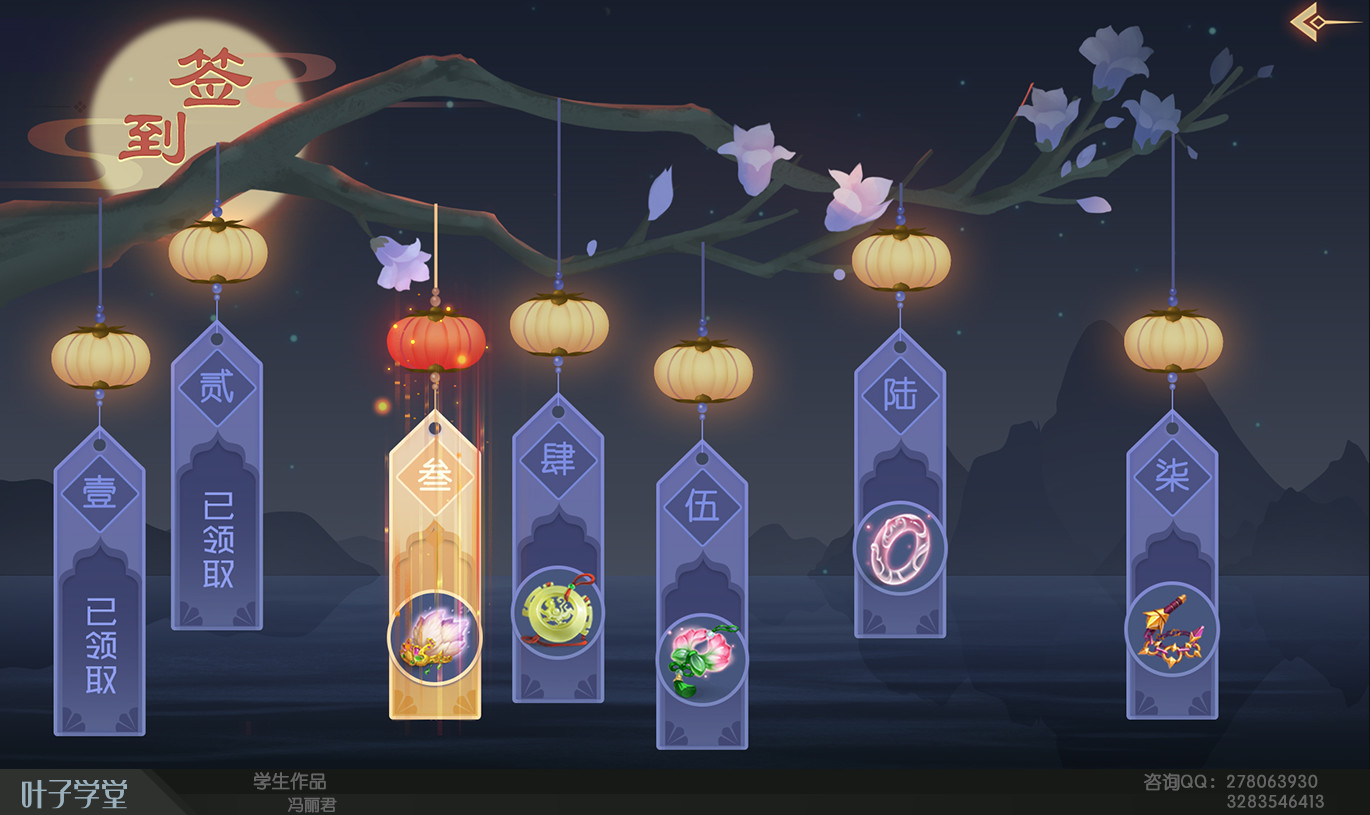 上期上榜过的冯丽君同学,本期放出她的第二套毕设“清河夜”(该妹子做了整整七套作业,并且每套的风格都很棒而且完成度也很高),这套中国风采用夜晚的蓝紫色为主色调场景,然而月光,灯笼以及灯光投射出渔夫的剪影,让夜晚显得美好静谧,梅花鹿和蝴蝶又让ui场景虚虚实实,如梦似幻。