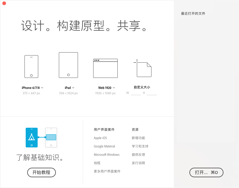 了解基础知识(Explore the basics)提供了一个基础教程,可以根据提示来进行操作,熟悉软件,学习基础操作。之前做了一个这部分的翻译和演示,不过目前XD已经是全中文版本,翻译out了演示还可以看看。《Adobe XD入门教程翻译+演示》