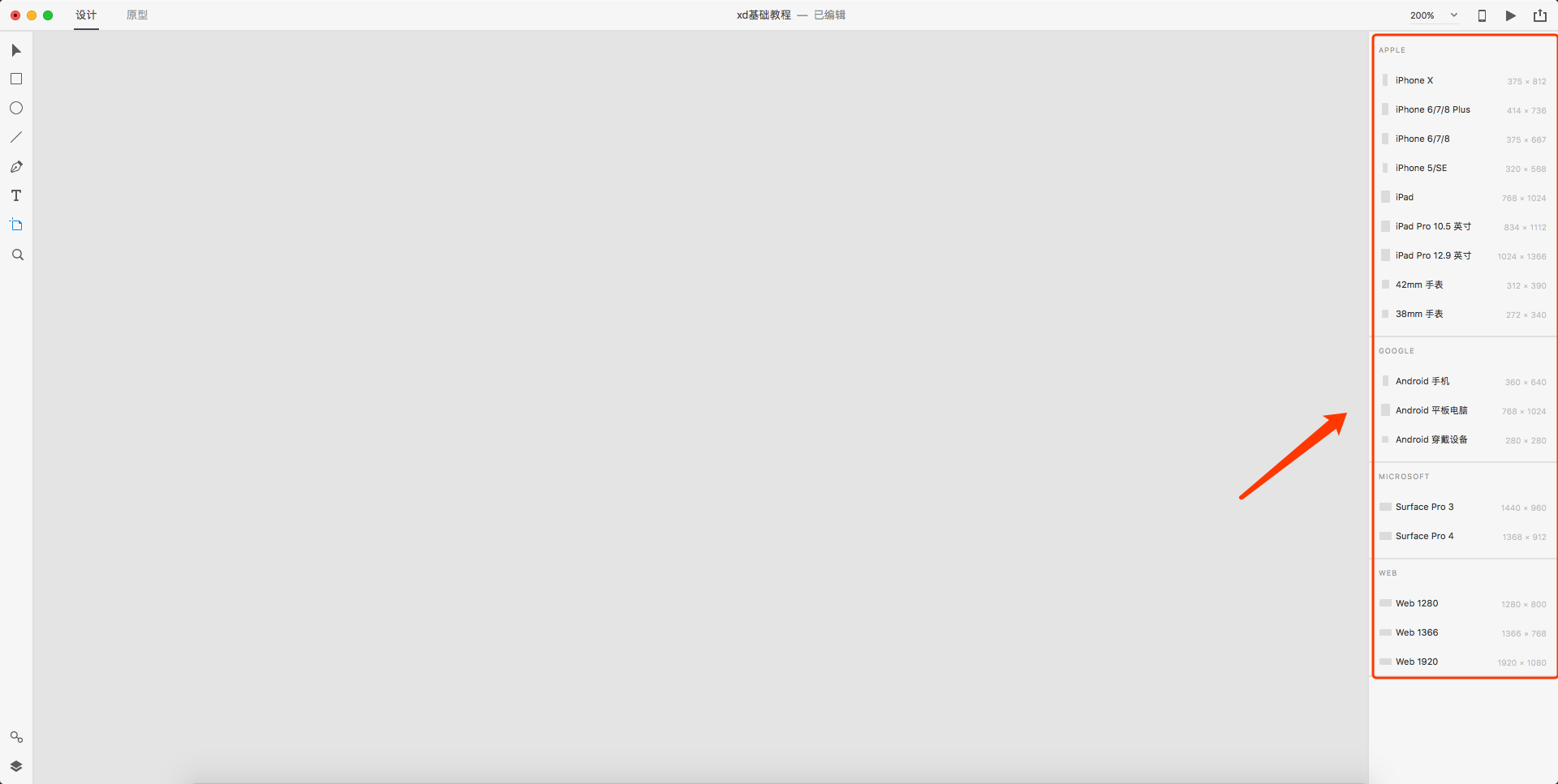 页面上展示了几种画板类型,根据项目类型选择相应的画板,或者自定义画板大小。在XD中是使用一倍图进行设计,由于XD是矢量设计软件,所以导出@2x、@3x也不会模糊不清。使用一倍图设计的另一个好处就是对应开发逻辑分辨率,开发同事可以直接使用,不需要再进行px和pt/dp的单位换算。