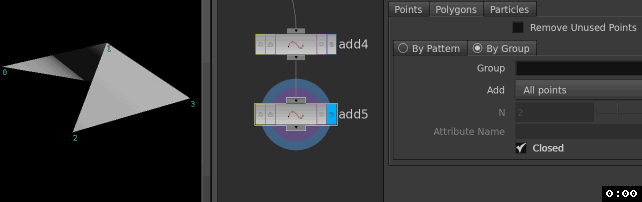 只要有一些点,你就能用add节点把它们连成面。将add节点的子面板模式改为“By Group”,houdini就会按照点的序号ptnum把点连成线(默认为折线polyline)。在这里我以一个2x2的grid为例,先连接一个add节点,勾选“delete geometry but keep the points”把它面给删了只留下点,然后再连上第二个add节点生成折线,最后勾选“closed”来让它变为一个完整的面: