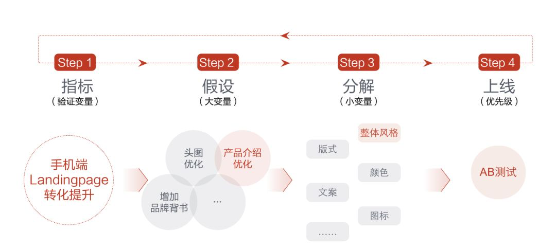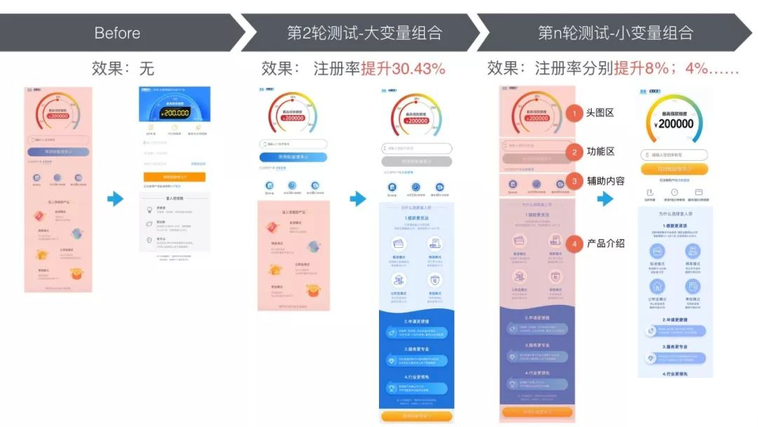 首先把页面分解成不同区域,逐个优化,其它部分保持不变,通过AB测试看效果,转化率立刻提升了30%;紧接着我们又把页面进行更细的拆分,逐个优化变量(文字、颜色、图标等),转化率提升8%。经过40天的连续实验,我们累计提升该页面转化70%以上,为公司节约了可观的营销成本。而谁能想到在此之前,我们花了几个月,出了十多版方案,数据都没有一点点提升!