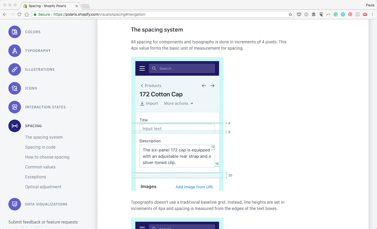 间距 - 与网格类似,间距是另一个有用的部分。在Shopify的设计系统(称为Polaris)中,他们详细介绍了不同的填充区域和卡片等元素之间的间距。他们也将行高称为间距。