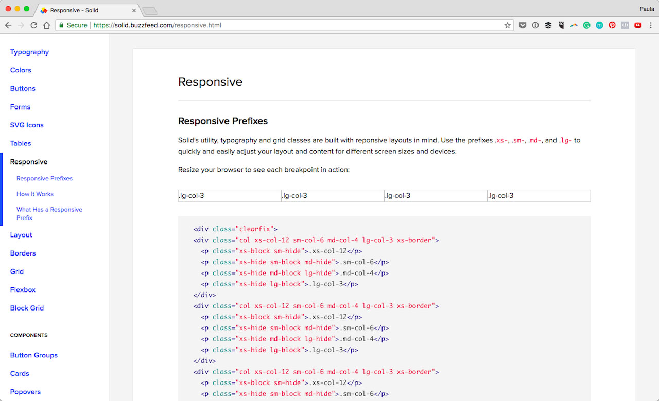 网格 - 是理解和统一页面布局的基本组件。看看 MailChimp 如何使用网格。这是他们设计系统模式部分下的第一项,它涵盖了不同的主题,如网格大小,间隔槽以及如何混合使用它们。BuzzFeed 的设计系统略有不同。它们有两个不同的部分,一个叫做Grid,另一个叫做响应式。它们都指的是网格系统的工作方式。响应部分只是一个扩展。