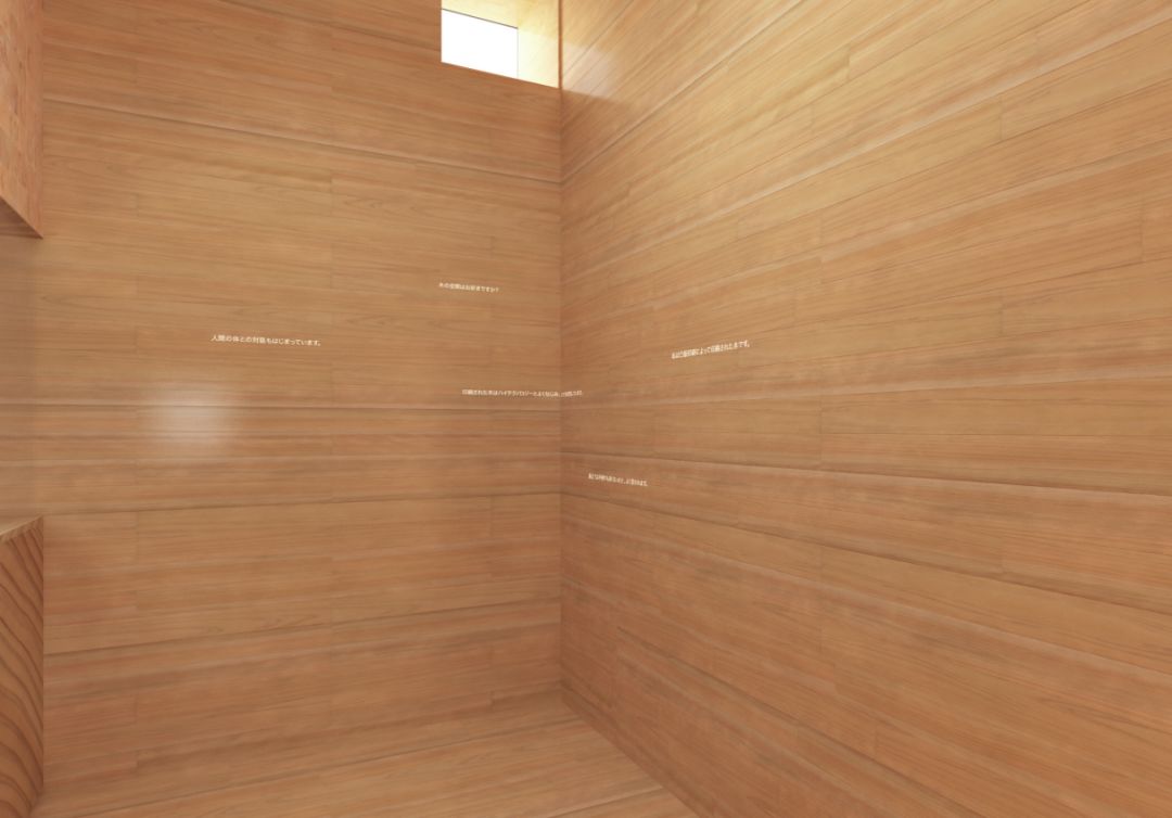 用于印刷木纹的“原稿”是吉野扁柏的木片,这是一棵来自奈良的年龄约120-160岁的树。设计者使用分辨率超高的扫描仪将木纹一条一条进行扫描,然后再扩大20倍,形成了呈现在参观者眼前的样子。