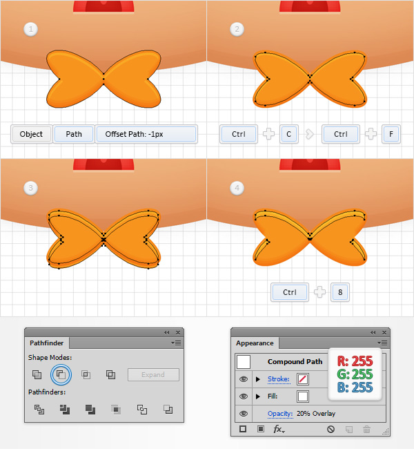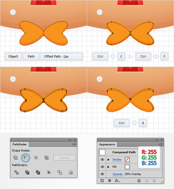重新选择在这个步骤做两个形状,然后单击减号前面的按钮从探路者面板。 打开结果组的形状为一个简单的复合路径( 控制-8),设置填充颜色为白色,降低其不透明度为20%,改变混合模式为叠加 。