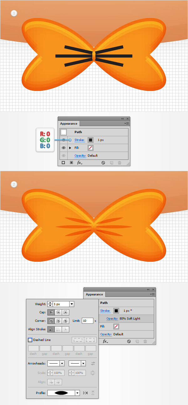 启用对齐网格 ( 视图>对齐到网格 ),并切换到网格线间隔1px的 。 使用钢笔工具(P),画出六个路径,如下图所示。 添加1点 ,黑色笔触为这些新的路径和重点的外观面板上。 降低不透明度为80%,改变混合模式为柔光 ,打开行程飞出面板。 专注于个人资料部分,只需选择宽度简介1。最终的东西应该像在第二幅图像。