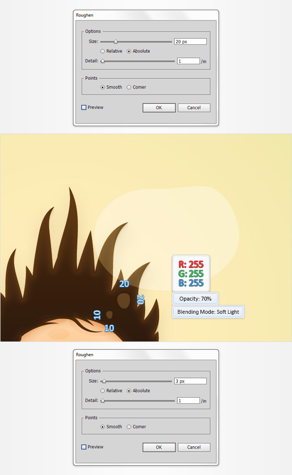 使用椭圆工具(L),创建一个20像素的圆和一个10px的圆,把它们大致为显示在下面的图像。 用白色填充两个形状,降低其不透明度为70%,改变混合模式为柔光 。 只选择20像素的圆,并去影响>扭曲和变换>粗糙化 。 请在顶部窗口(如下图)显示的属性,然后单击确定 。 选择10px的圆和去效果>扭曲和变换>粗糙化 。 请在下面的窗口(如下图)显示的属性,然后单击确定 。