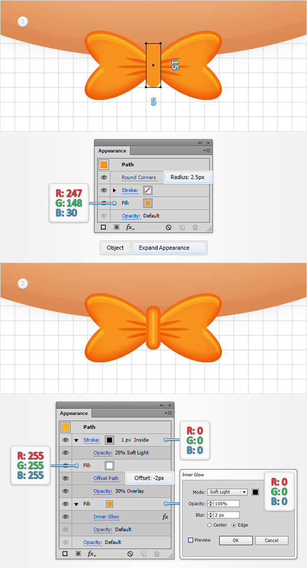 添加第二个填充你的形状,设置颜色为白色,降低其不透明度为30%,改变混合模式为叠加 ,去影响>路径>偏移路径 。 输入-2px的偏移 ,然后单击确定 。 返回到外观面板,并添加1px的 ,黑色的笔触你的形状。它对齐到内, 混合模式改为柔光 ,降低其不透明度为25%。