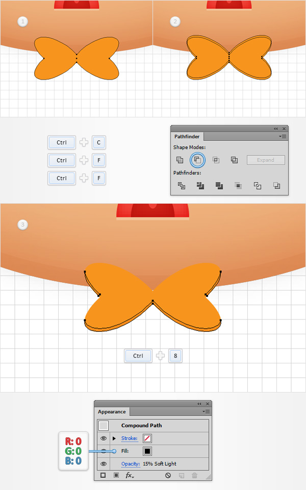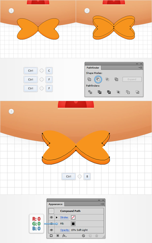 重新选择在这个步骤做两个拷贝,然后单击减号前面的按钮从探路者面板。 打开结果组的形状为一个简单的复合路径( 控制-8),设置填充颜色为黑色,降低其不透明度为15%,改变混合模式为柔光 。
