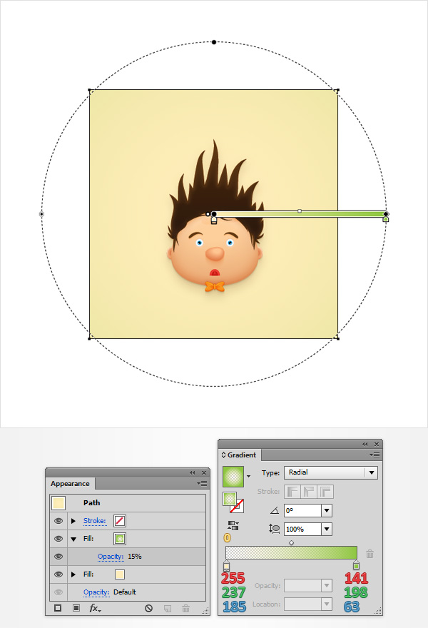请确保您的“BG”形状选择和使用相同的添加新的填充按钮,添加第二个填充。 选择新的填充,降低其不透明度为15%,并添加如下图所示的径向渐变。 使用渐变工具(G),伸展你的渐变,如图下面的图片,并记住,从梯度图像的黄色零表示不透明度百分比。