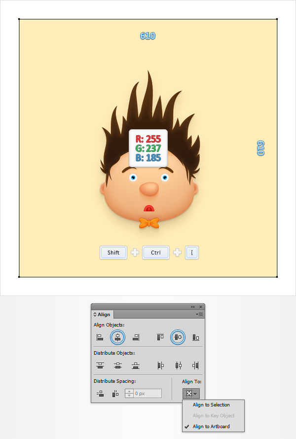 使用矩形工具(M),创建一个610 x 610px广场,设置填充颜色为R = 255 G = 237 B = 185,并将其发送到后( 按住Shift键-控制- [)。 移动到图层面板,简单地重命名这个新造型“BG”。