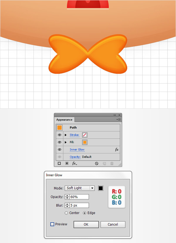 请确保您的“ 领结 ”形状被选中,去影响>风格化>内发光 。 进入如下图所示的属性,然后单击确定 。