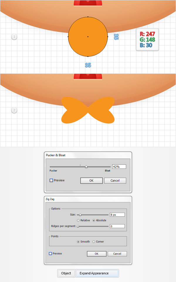 请确保您的橘黄色形状保持选中并去影响>扭曲和变换>折叠和膨胀 。 拖动滑块为42%,单击确定 ,然后转到效果>扭曲和变换>之字形 。 进入如下图所示的属性,单击确定 ,然后转到对象>扩展外观 。