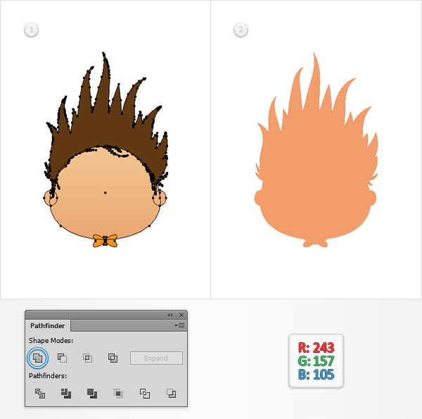 重新选择前面的“ 脸 ”组,然后单击团结按钮,从探路者面板。 确保生成的形状被选中,并设置其填充颜色为R = 243 G = 157 B = 105。 移动到图层面板,简单地重命名此步骤中的 “ 影子 ”提出的形状。