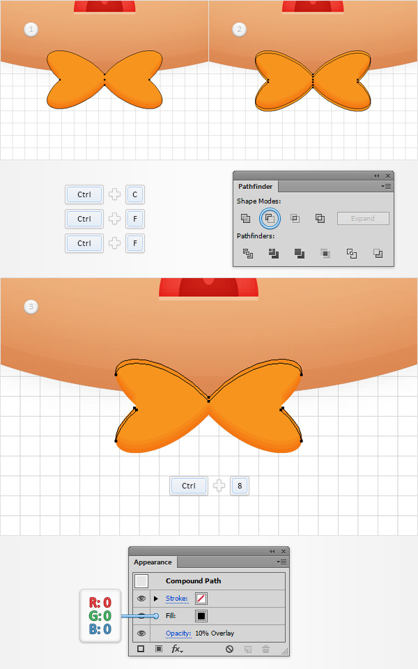 重新选择在这个步骤做两个拷贝,然后单击减号前面的按钮从探路者面板。 打开结果组的形状为一个简单的复合路径( 控制-8),设置填充颜色为黑色,降低其不透明度为10%,改变混合模式为叠加 。