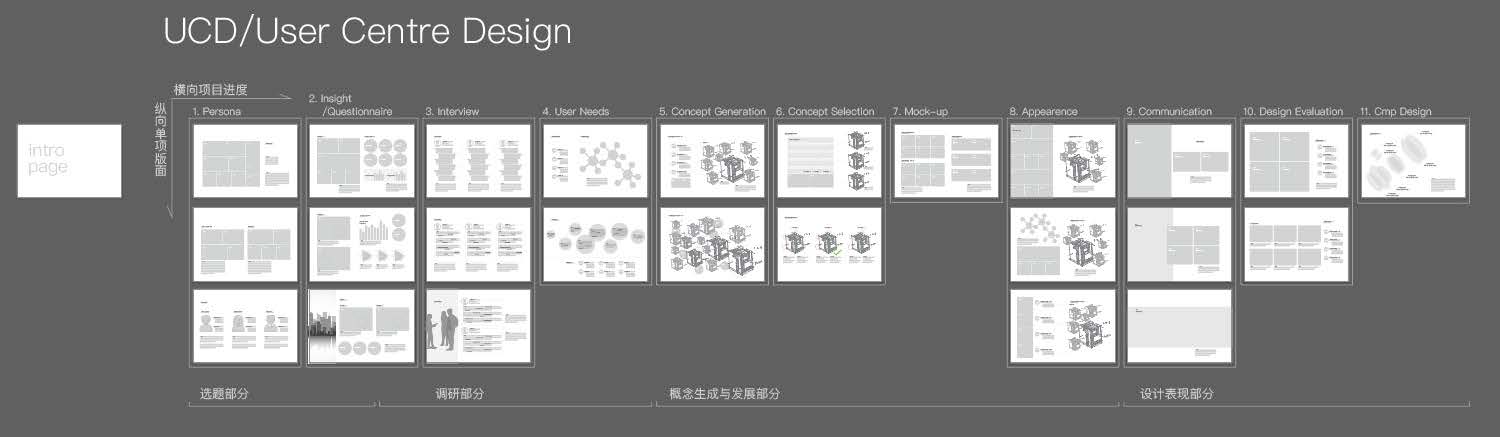 以用户为中心的设计,或者 User-Centred Design 应该是最传统的工业设计思路,所以在典型的工业设计作品集中,第一个项目一般都会尽可能靠近UCD的设计思路,大致分下来,UCD 的典型内容可以分为如下步骤(为了方便对应作品集制作,核心要点均用英文):