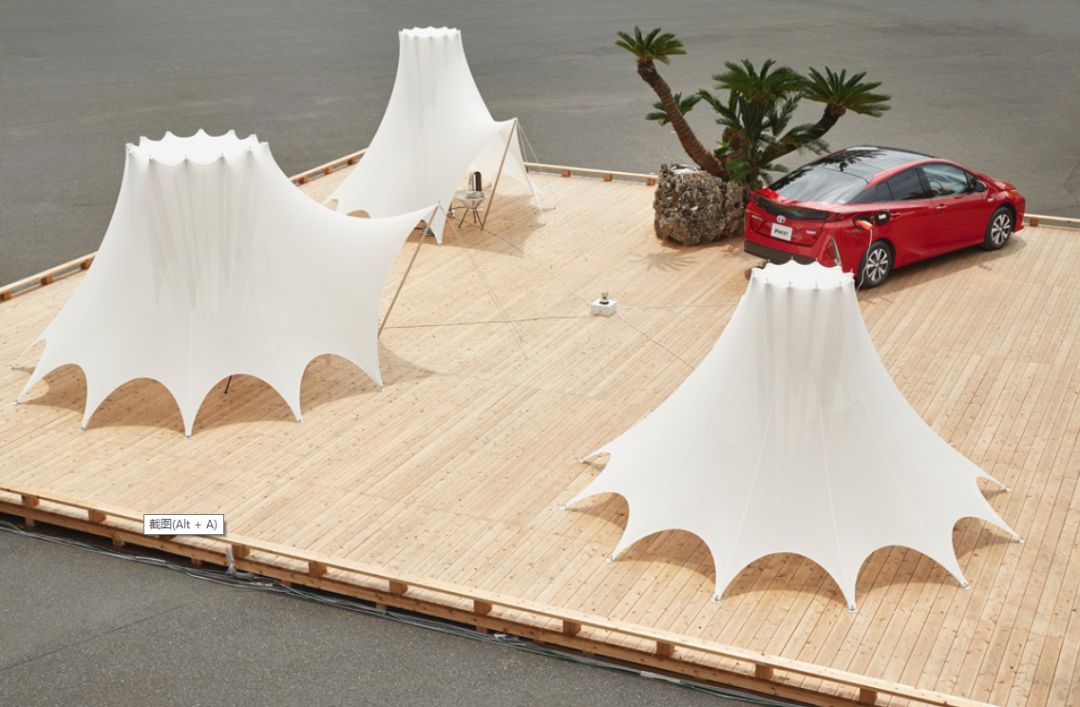 在这一技术的基础上,隈研吾先生在汽车后备箱内放入了碳素纤维骨架以及牢固的纤维帐篷布。同时打开这些帐篷,能获得超出想象的巨大空间。碳素纤维可折叠收纳、十分坚韧,强度约是铁的7倍,帐篷撑开直径可达5米,而拆开折叠后仅有65厘米,分大人尺寸与儿童尺寸。它最大的特点是轻盈,三顶帐篷加起来的重量比一位女性的体重还要轻。
