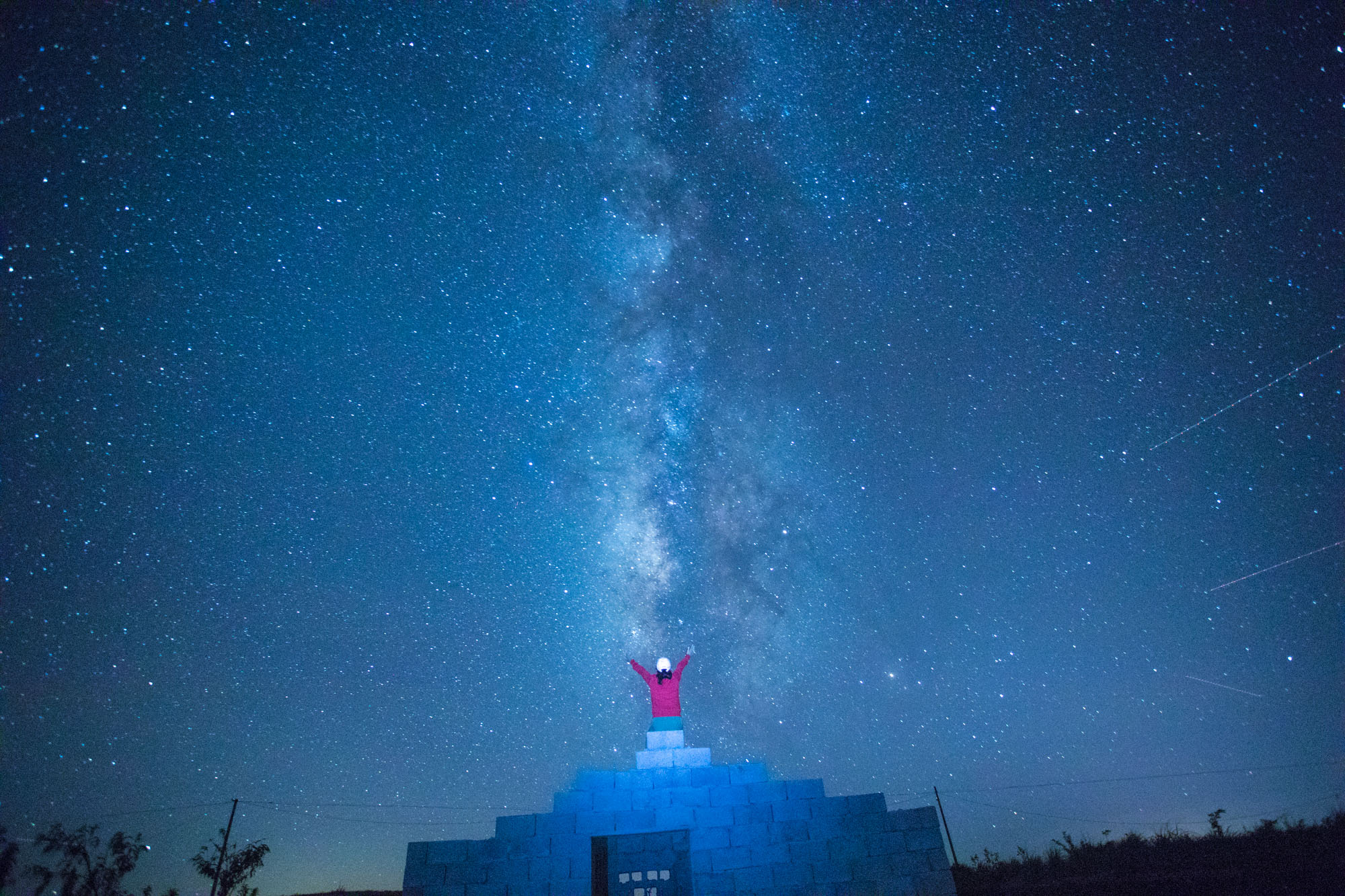 不然在头顶会拍不全,人站在银河正前方,