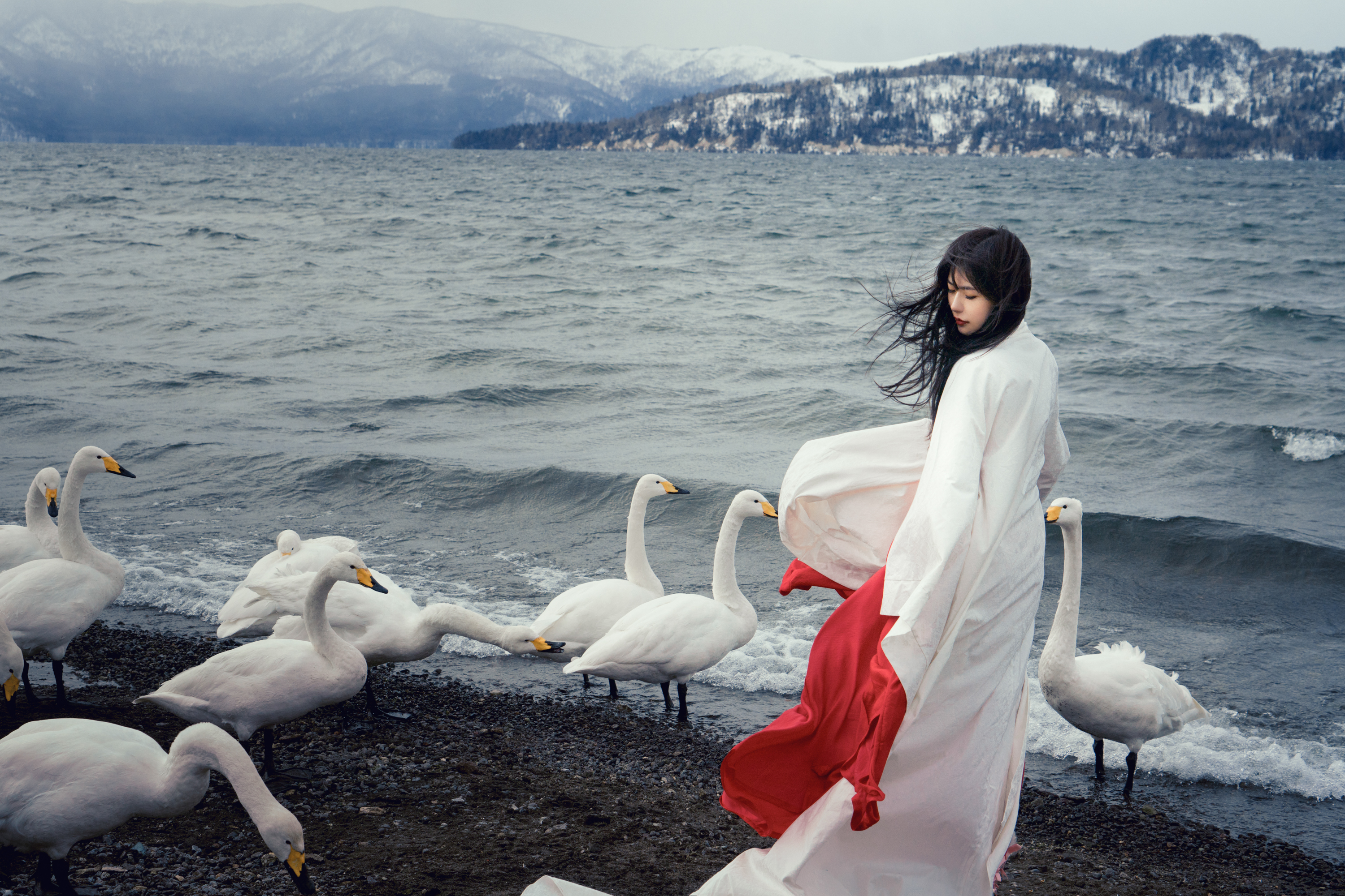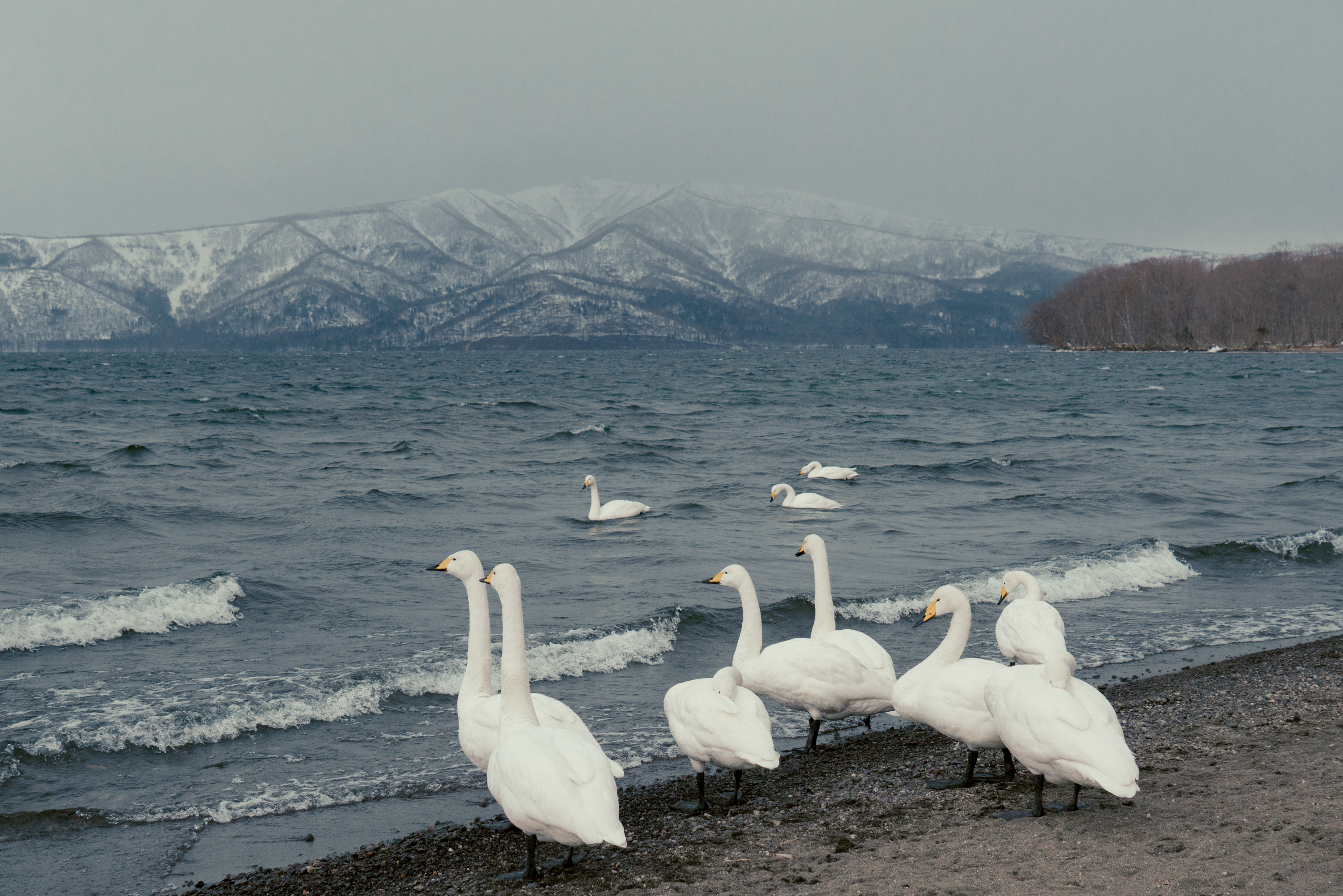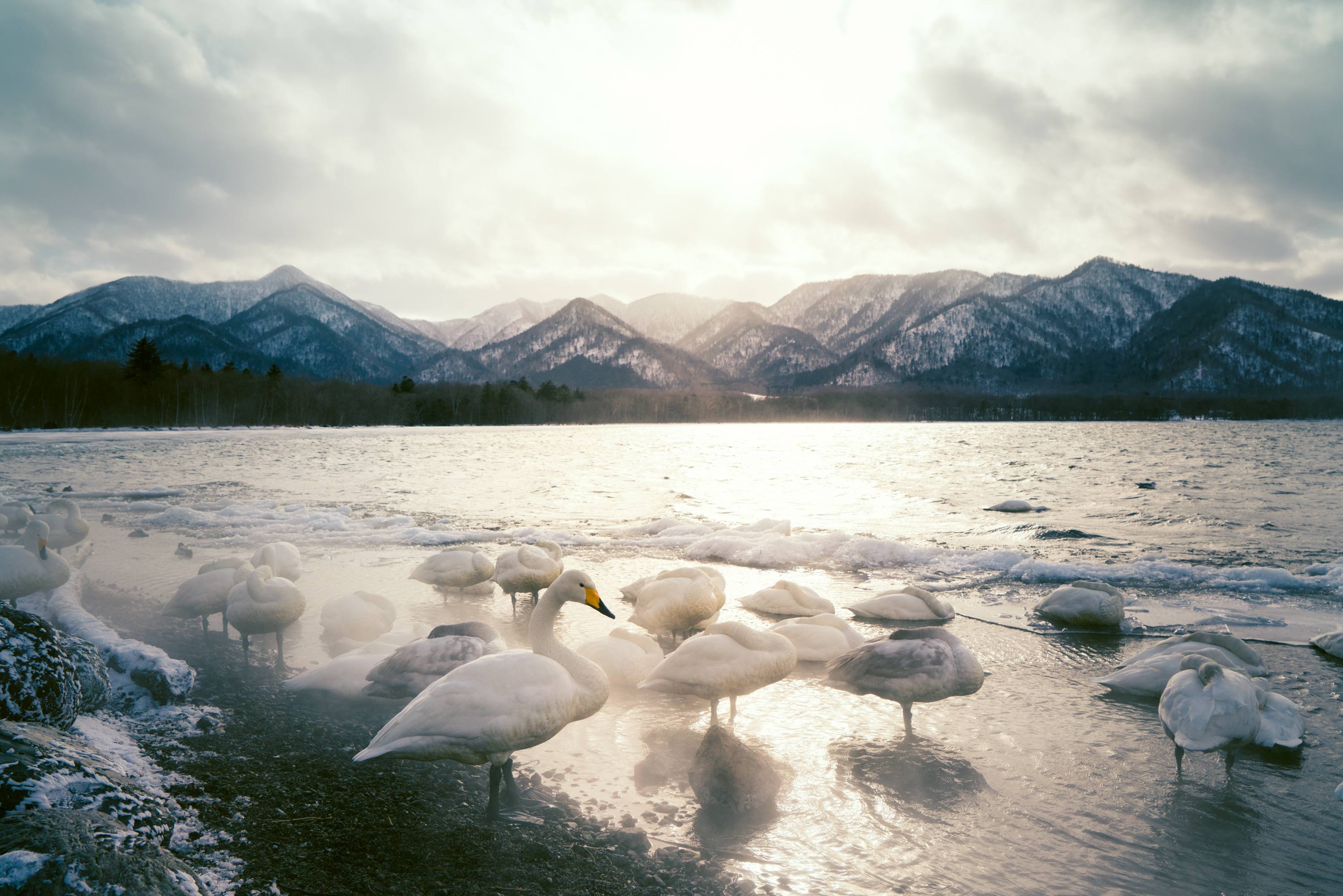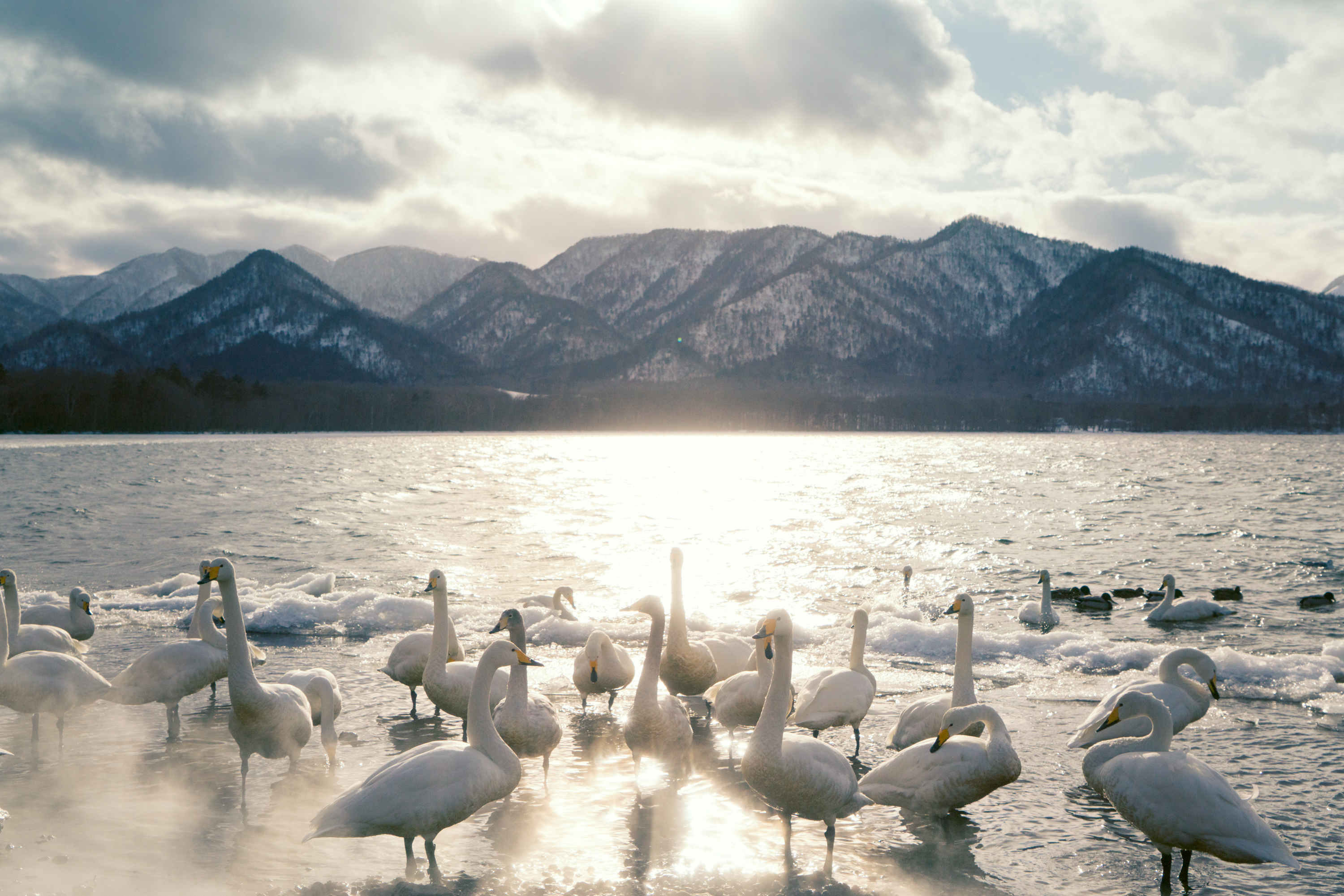 这里因为有温泉的关系,即使是在冬季,也会吸引大量的天鹅在这里过冬,时不时的温泉水会飘散出很多白色的雾状蒸汽,画面看上去真的好像冬天的精灵一样。