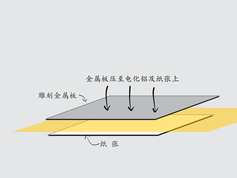图2,将烫金版加温到100-150度左右,下压,接触电化铝后,压力作用到纸张上;