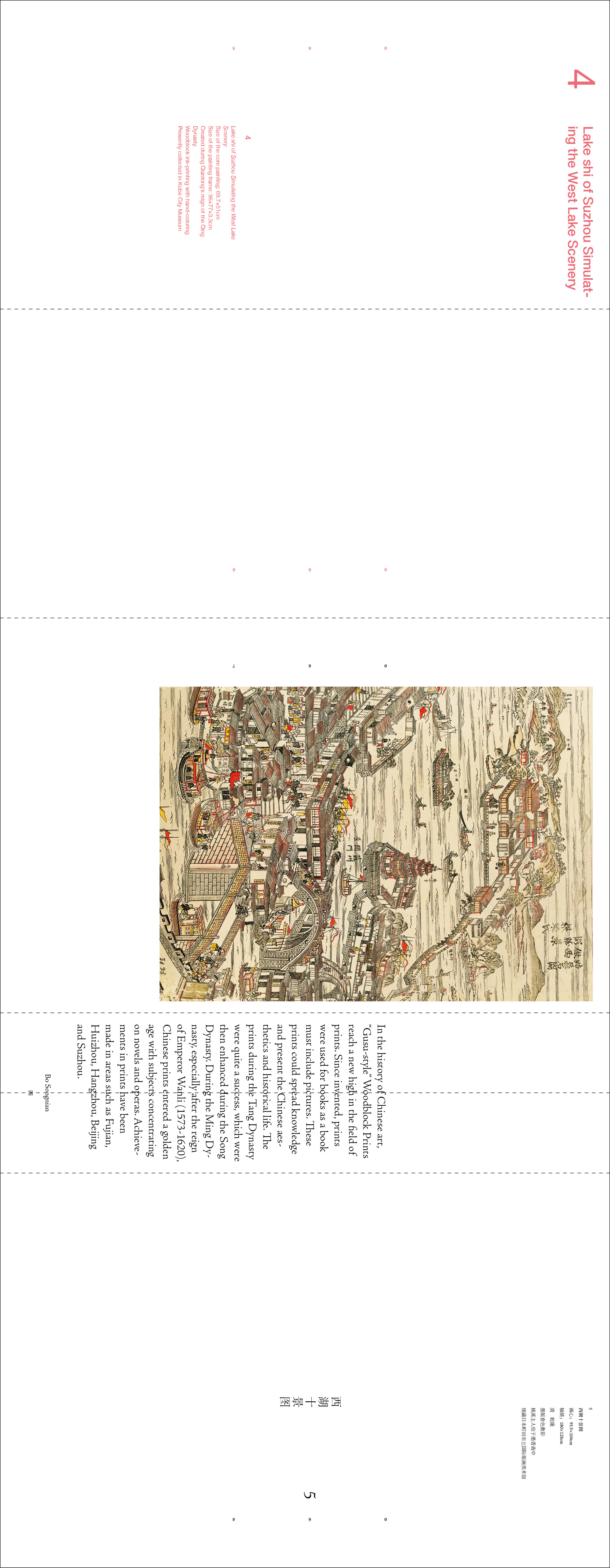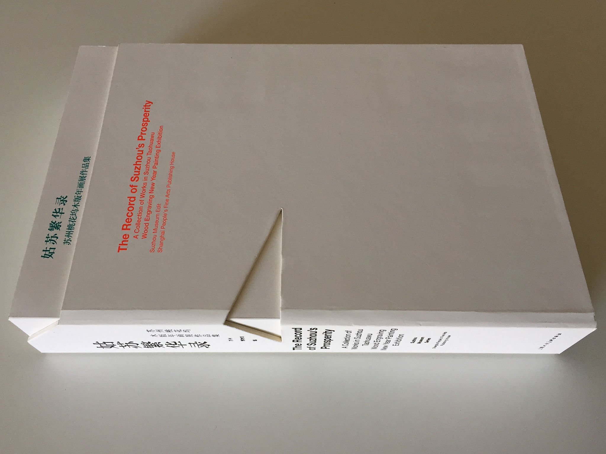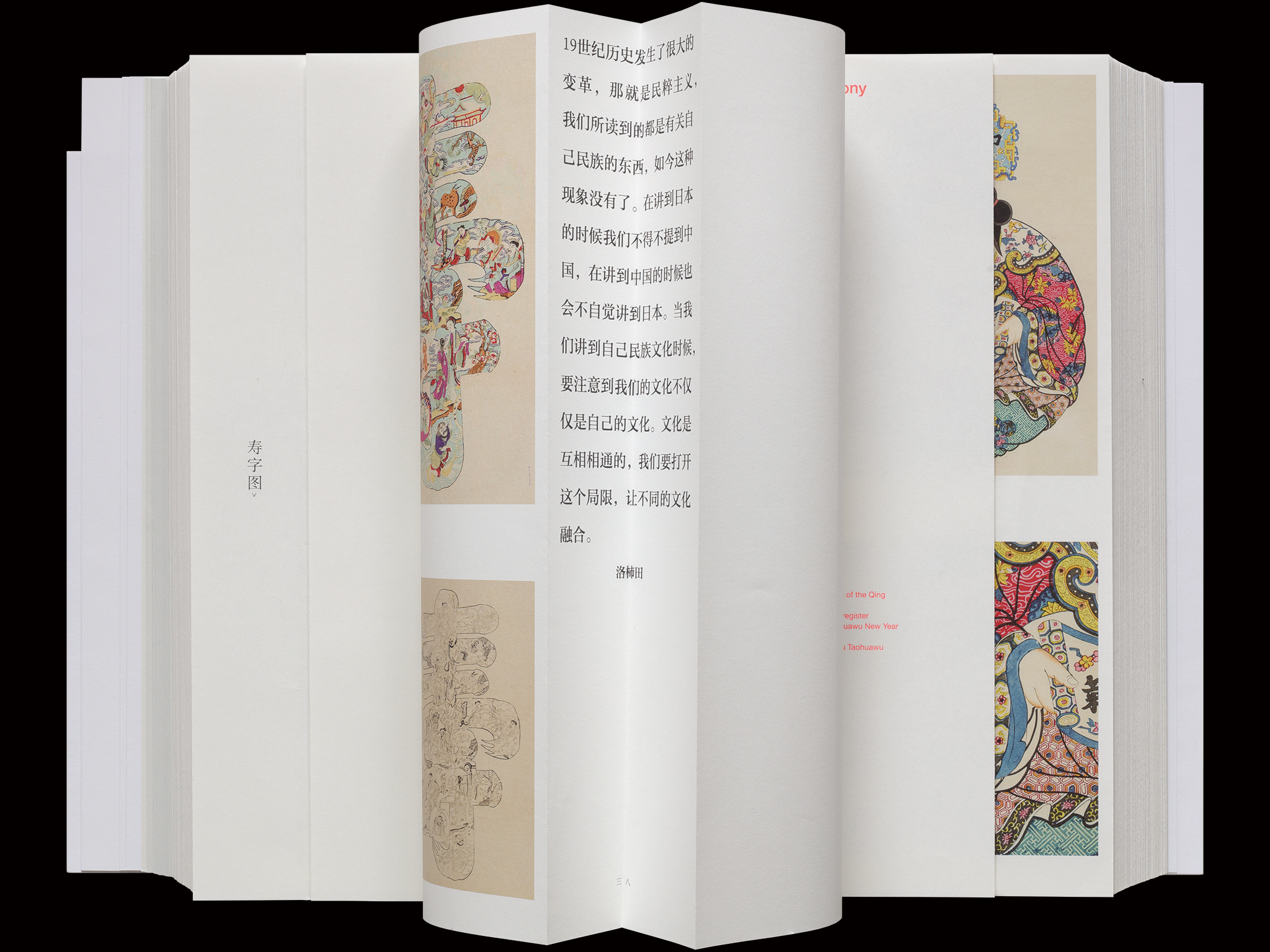 书籍形态是对文本体例进行视觉编辑和对文本特点的当代性再现,这也是XXL Studio的设计理念:任何古典题材的重新出版,都应该赋予它当代的视觉语言和新的阅读体验。本书设计将不同体例内容分别置于不同形式页面,是功能和美学的结合:筒子页(图版英文介绍)填平了因为M折带来的厚度问题,同时将画面的大部分遮住,观看>翻开>进入木板年画的殿堂,营造出阅读的节奏和质感; M折正面:四色印刷的桃花坞木版年画,背面,下一幅木版年画中文介绍;M折内的文字:中英文展览研讨会辑要(读者不想看就忽略);拉页:展览现场。