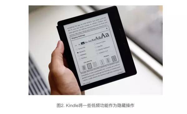 一个经典的例子是各种电子书阅读应用,无论是手机、平板设备上的,还是在 Kindle 这样的专用设备上。当用户在阅读时,真正需要用到的信息和操作并不多,文章内容、前后翻页、标题和页码,这就足够了。更多的操作和信息,例如设置字体大小、搜索等等,是用户有时可能会用到的,但没有那么高的使用频率,于是将它们都隐藏起来,只有用户点击界面的中间位置时,才会将他们显示出来。这样的设计已经成为电子书阅读通用的模式(Pattern)。