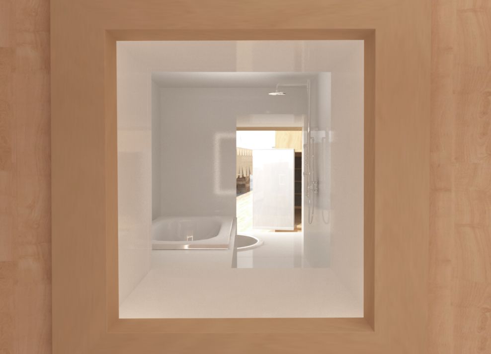 在这次的设计中,打开和房子规模一般大的大门,然后就进入像客厅一样的房间,在那个房间里设计了“窗户”。这扇“窗户”颇有“深度”,彷如截面不断扩大似的,里面有各种各样的“居住空间”。这些居住空间既是“内部”和“外部”的“空间”,也是“家具”和“建筑”的“空间”。窗户中有居住空间,在那儿可以获得居住体验,然后不断扩展。
