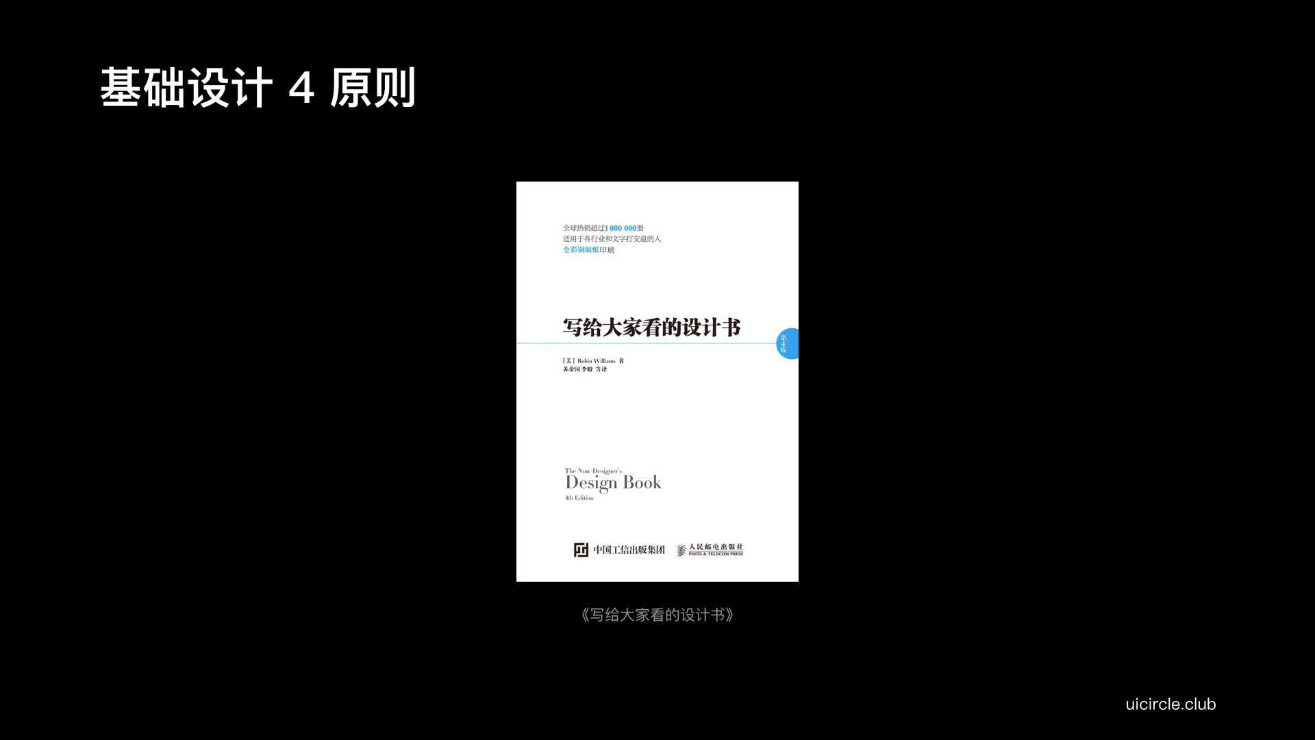 在介绍上面 4 个要点之前,我还想简单介绍下 Robin Williams 的《写给大家看的设计书》。这是本非常适合大众学设计的入门书,书中提到了最为基础的设计 4 原则。虽然很老,但是非常经典。