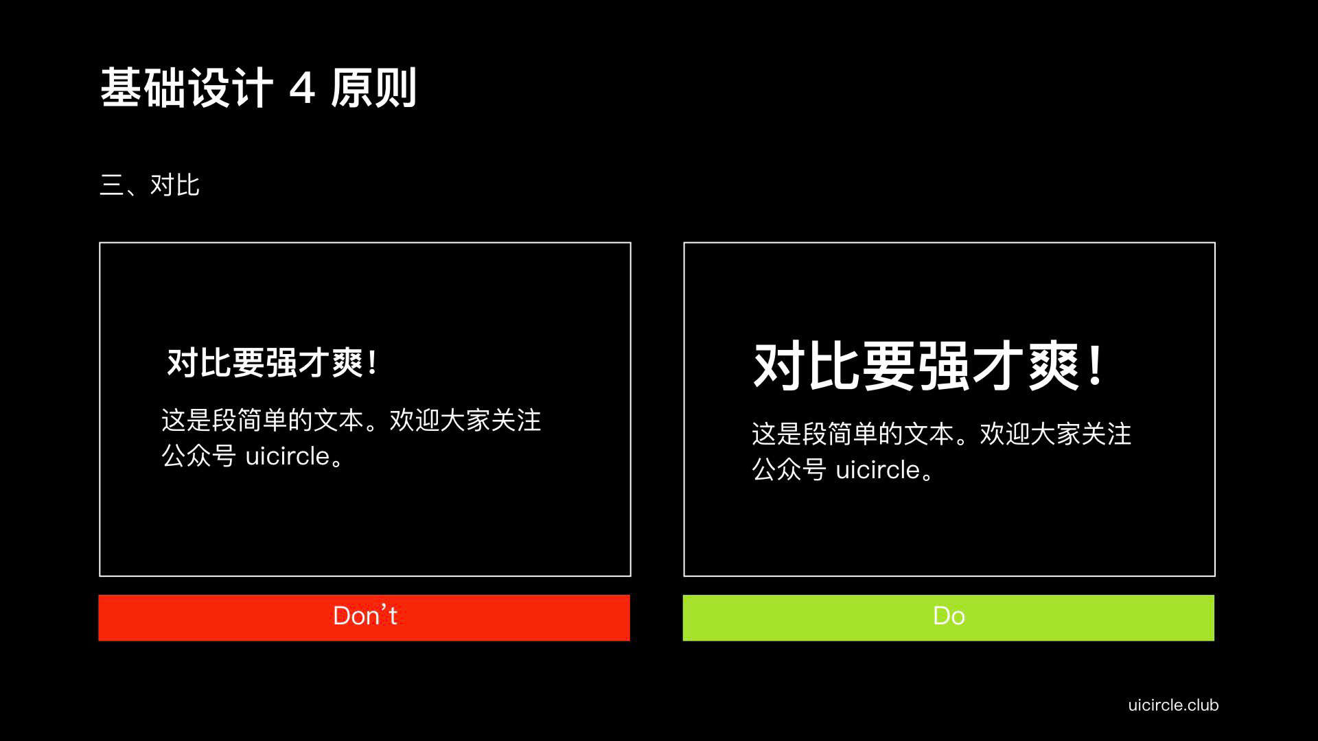 当我们希望突出某个信息的时候,一定要加强对比。像左图那种弱小的对比,是很难达到对比的视觉效果的。因此,大胆使用「对比」,让画面更有主次。