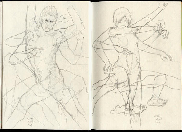 随着绘画技巧的进步,逐渐脱离了最初帮助自己起步的工具,如人体动作展示工具,解剖书等。画出一个动作以后,会琢磨不变身体位置,还能衍生出什么动作,于是画出了一些类似八爪鱼或三头六臂的人物线稿。看似怪异,实际还挺有挑战的。