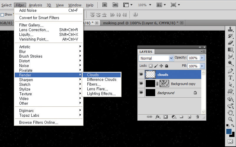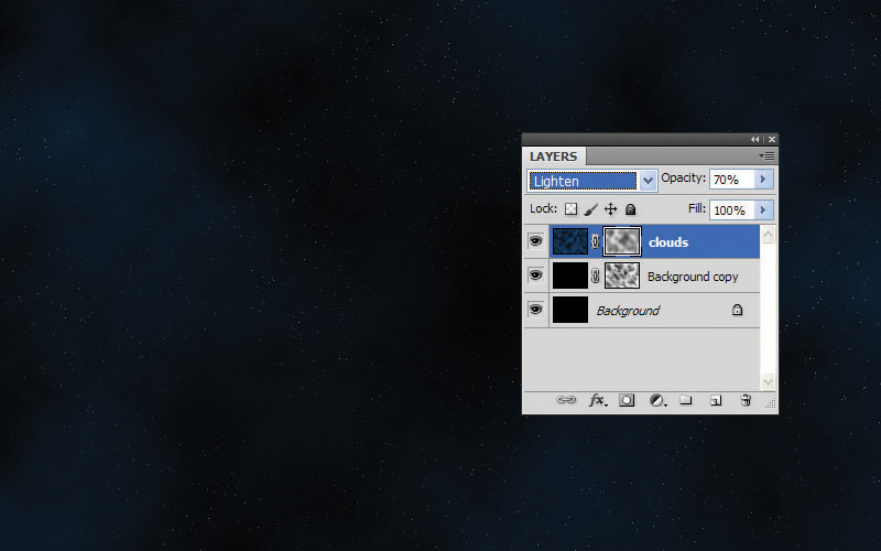 分层云彩的使空间感觉更真实,设置前景色 #1e5285,背景色 #000000,然后新建图层命名为clouds,先填充背景色一下,然后选择[ 滤镜 ] > [ 渲染 ] > [ 分层云彩 ]蓝色的云就形成了。