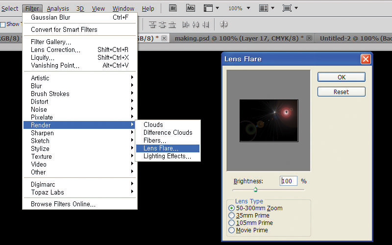 [滤镜]>[渲染]>[镜头光晕]然后,选择镜头型号50-300mm的变焦,调整好合适的镜头的方向位置确定