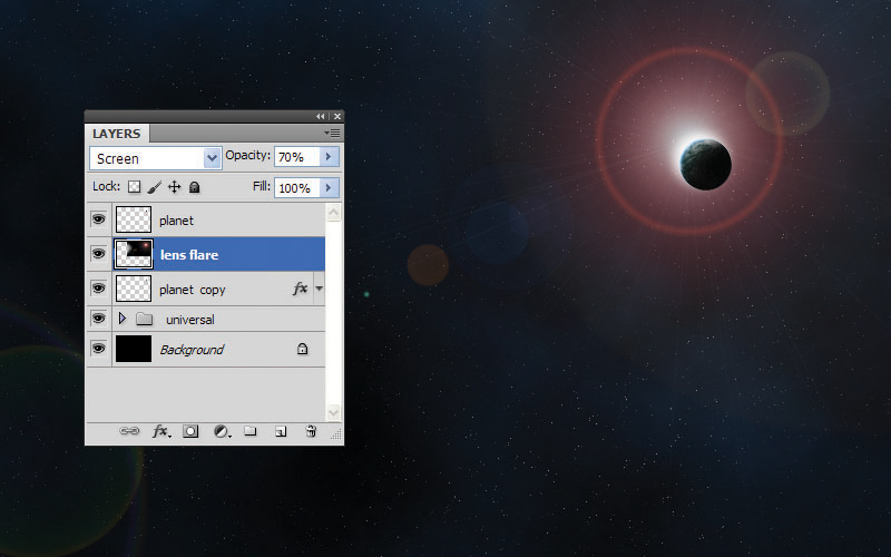混合模式为滤色,不透明度70%设置。该层的位置拖到地球的图层下面,调整位置置在左上角露出地球。透镜层不显示的部分和边界使用橡皮擦工具擦除。因此,真正的宇宙背景完成。