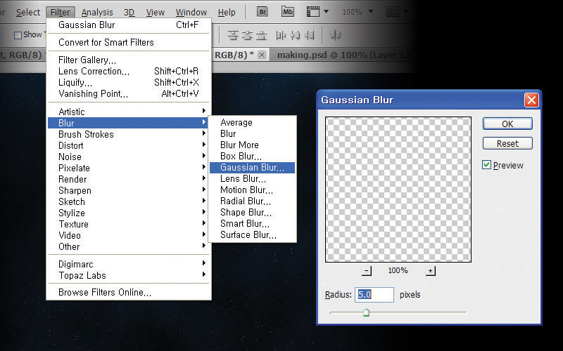 在菜单中[滤镜]>[模糊]>[高斯模糊]被选中。选择半径5.0像素,然后点击确定