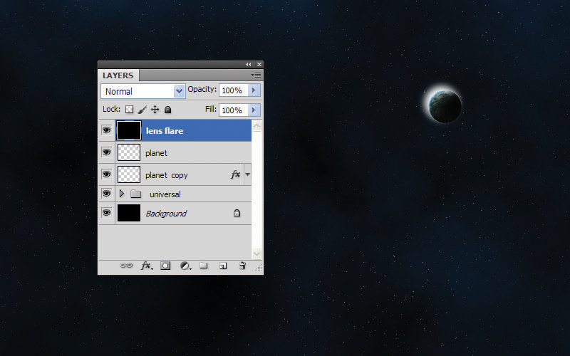 使用键盘上的箭头键在图层底部的行星向10点钟方向移动,接下来创建一个新图层填充黑色,添加黑色镜头光晕命名为chaewojugo