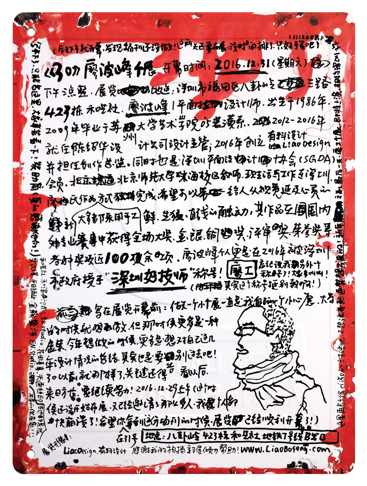 廖波峰(廖工),平面设计师,1986年生,2009年毕业于苏州大学艺术学院装潢系,2012~2016年就职于深圳陈绍华设计公司,任设计主管,主创过多个重大项目。2016年创立有料设计(LiaoDesign),并担任创作总监。廖工是深圳市平面设计协会(SGDA)会员,曾担任北京师范大学(珠海校区)教师,现工作和与生活在深圳。廖工在创意过程中擅于运用材料、装置、影像等新鲜语言,产生延及心灵的社会性对话,通过有趣、灵性的创意来直意表达生活探索和社会参与。其作品在国内外专业赛事中获得多个奖项。2016年底在深圳举办《30》个人展览,当年被评选为深圳市30位35岁以下“行业菁英”之一,并授予“深圳市技术能手”、“深圳好技师”称号,受到市政府嘉奖。