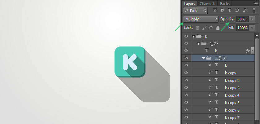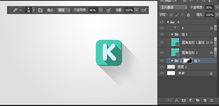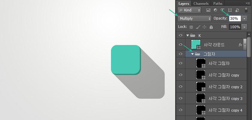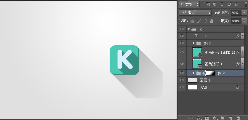 选择阴影的文件夹,设置混合模式为正片叠底,不透明度30%,这里的阴影形状就完成。