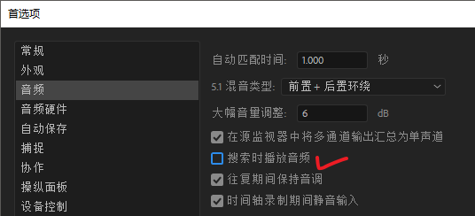 同样在首选项里可以将这个功能关闭,具体在音频【搜索时播放音频】不勾选即可,还你一个清静专注的的剪辑环境!