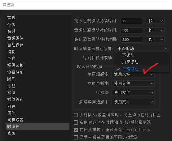 更改的方式也很简单,在【首选项-时间轴-时间轴播放自动滚屏】设置【平滑滚动】即可。