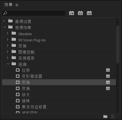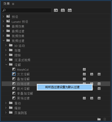 在效果窗口下,可以看到交叉溶解前面有个蓝色小方框,代表的是默认视频的过渡效果。对着任何过渡效果右键均可以设置为默认过渡效果。