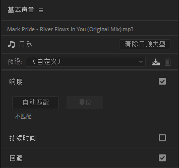 在【基本声音】音乐的选项版里,我们可以看到有自动匹配响度、修改持续时间等功能。而在最下面的【回避】选项则是应用了机器学习的自动生成关键帧功能。
