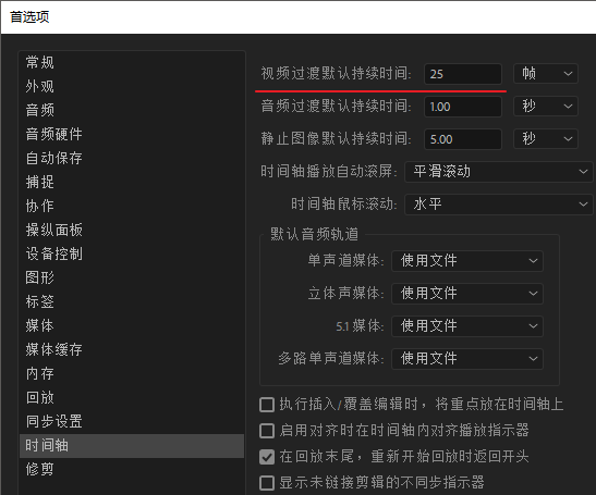 (▲音频过渡的默认持续时间也可以在这里更改)