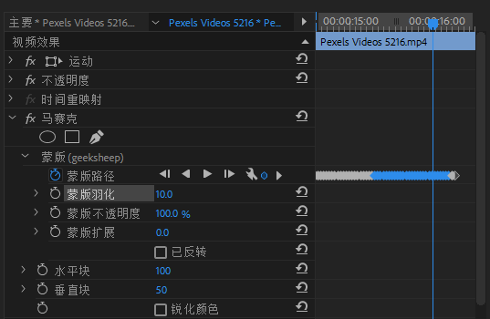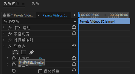 在效果控件(Effect Control)里面设置马赛克效果的参数,创建一个椭圆形蒙版来模拟人脸外形,当然特殊情况下也可以用自定义的贝塞尔曲线蒙版。