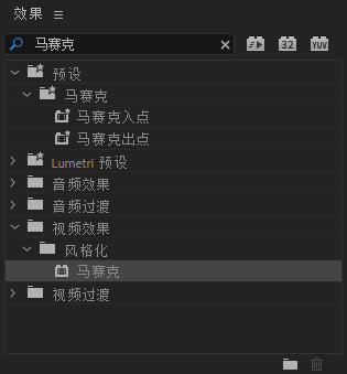 首先在效果(Effect)里面找到马赛克(Mosaic ),在视频效果风格化里面。拖到视频片段上来应用。