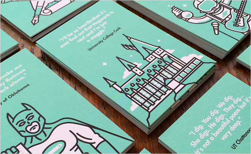 基于位置的社交网络Yik Yak创建了这些令人难忘的名片,这些名片背离了常规:他们决定用自己喜欢的用户报价创建各种卡片,而不是典型的公司信息。