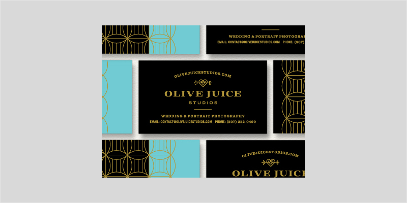 绿松石和黑色与金箔的美丽组合。作为婚礼和肖像摄影工作室的名片,它在一个设计中完美地传达了优雅和活力。